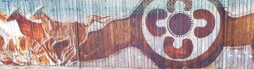 Kerry Stack and Olivia Samec - small section of a 30 metre long mural using Balga resin and ochre - Fremantle Western Australia. This mural recognises and pays respect to the thousands of generations of Noongar people who inhabited South Fremantle, making their way to the beach from inland and vice versa, until recent times and colonisation.